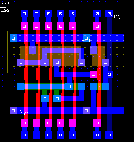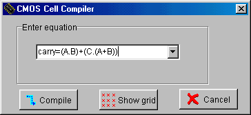 W programie Microwind możemy korzystać z wbudowanego kompilatora układów logicznych. Z menu głównego wybieramy Compile->Compile One Line i wpisujemy równanie projektowanego układu logicznego. W równaniu tym znak '/' odpowiada operacji logicznej NOT, znak '.' to operator AND za¶ '+' to operator OR. Po wci¶nięciu Compile topografia układu zostaje automatycznie wygenerowana. Poniżej przedstawiono przykład równania i wygenerowanej topografii układu obliczania przeniesienia w sumatorze: