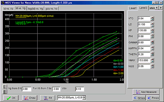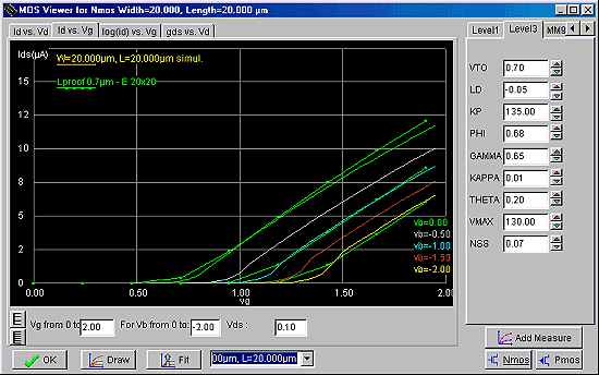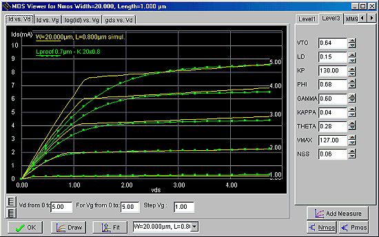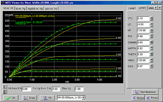 Klikamy na opcji wyboru charakterystyki Id vs Vd. Dobieramy VMAX aby ustalić punkt przejścia z zakresu liniowego do nasycenia. Następnie możemy dobrać KAPPA aby otrzymać odpowiednie nachylenie charakterystyki w obszarze nasycenia.