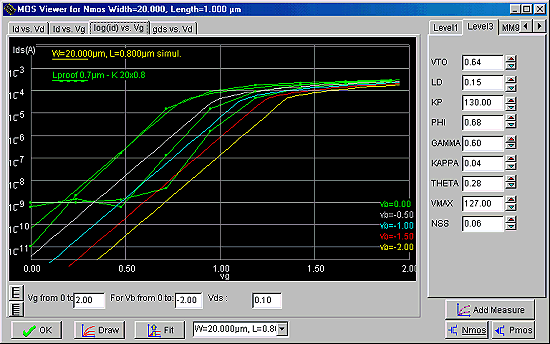 Klikamy na opcji wyboru log(Id) vs Vg. Sprawdzamy czy w zakresie podprogowym nachylenie jest poprawne. Jeśli nie to możemy je skorygować za pośrednictwem parametru NSS.