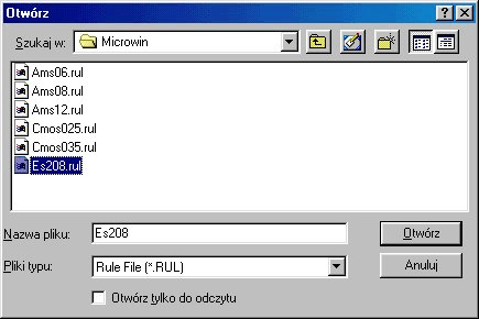Przed rozpoczęciem rysowania topografii układu należy wybrać technologię, w której będziemy pracować. W tym celu wybieramy z menu File->Select Foundry, a następnie w pojawiającym się oknie dialogowym wybieramy odpowiedni plik technologiczny, tak jak pokazano poniżej: