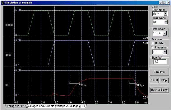 Kiedy napięcie na bramce jest równe zeru, kanał nie istnieje, tranzystor nie przewodzi i węzeł s1 jest odłączony od drenu. Kiedy napięcie na bramce jest równe 5V, napięcie na źródle jest równe 4.2V - napięciu na drenie pomniejszonym o napięcie progowe. Klikamy na Simulate aby kontynuować symulację dla dalszych chwil czasowych, klikamy na Back to Editor aby zakończyć symulację.